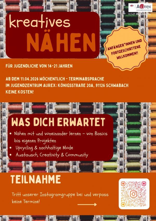 Ab 11.04.2026 startet unser wöchentliches Format „Kreatives Nähen" im Jugendzentrum AUREX!