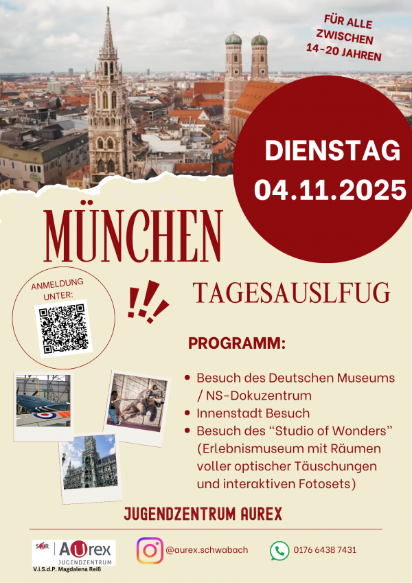 Die Kosten von 12 € beinhalten Zugfahrt, ÖPNV in München & Museumsbesuch. Das Geld kann entweder Bar im Vorab während der Öffnungszeiten des Jugendzentrum Aurex vorbeigebracht oder per Überweisung geschickt werden. (s.h. Häckchen unten).